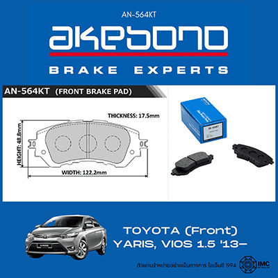 รหัสสินค้า AN-564KT AKEBONO T/T NEW YARIS, VIOS (F) AKEBONO ผ้าเบรคล้อหน้า TOYOTA NEW YARIS , VIOS ปี 2013 โตโยต้า นิว ยาริส , วีออส ของแท้ 100% คุณภาพเทียบเท่าของติดรถ เทคโนโลยีญี่ปุ่น “จัดจำหน่ายโดย IMC 1994 ตัวแทนอย่างเป็นทางการประเทศไทย”